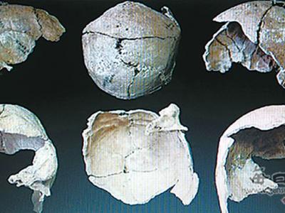 “泾川人”头骨化石(左起)李盛华、黄慰文、刘玉林、...