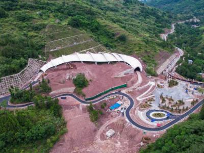 从空中俯瞰,建设中的云阳恐龙国家地质公园遗址馆呈“一"字型由东向西展开,宛如一...