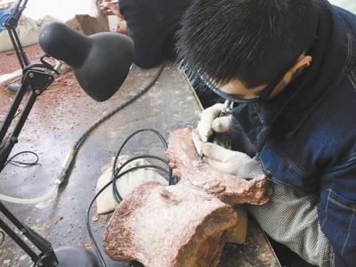 技师用细细的枪头清理化石 正在装架的大唇犀化石标本 (中国化石网报道)据四...