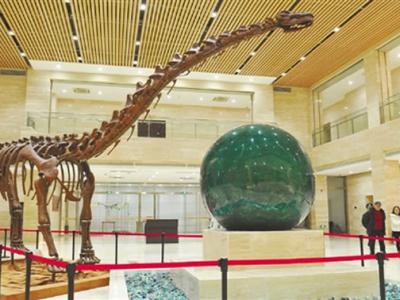 天宇自然博物馆入口处的恐龙骨骼化石。根据吉尼斯世界纪录,该博物馆是世上最大的...