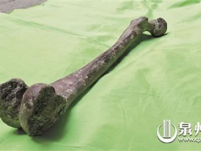 这根化石可能是目前发现的第三根“海峡人”骨化石 刘志成向记者展示这根股骨化...