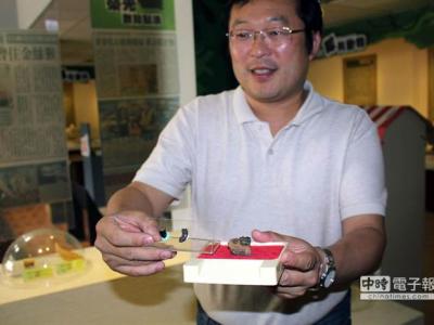 张钧翔博士18日展示菜寮化石馆的珍稀豪猪(左)、黑熊的牙齿化石。 (黄文博摄)...