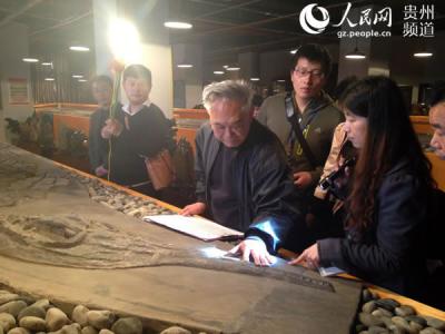 专家在测量一块约十米长的鱼龙化石 (中国化石网报道)据人民网贵阳4月1日电(赵...