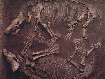 同一化石坑埋藏的两具披毛犀全身骨骼化石(中国化石网配图 图片:内蒙古博物院)...