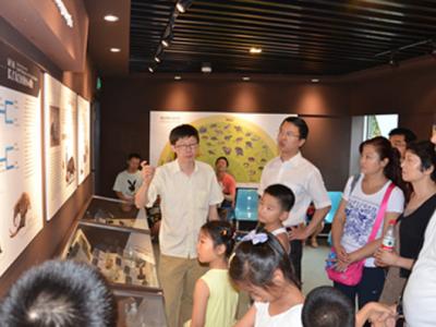 王原馆长(左一)给嘉宾和观众讲解 (中国化石网报道)据中国科学院古脊椎动物与...