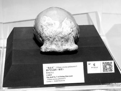 博物馆新馆内展出的北京人头盖骨化石模型 观众在博物馆新馆参观 (中国化石网...