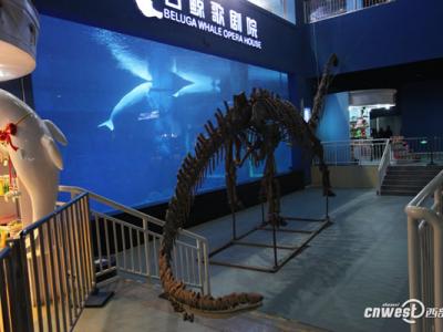 极地馆白鲸歌剧院来了让人震撼的马门溪龙 工作人员正在布展 极地馆内的恐龙...