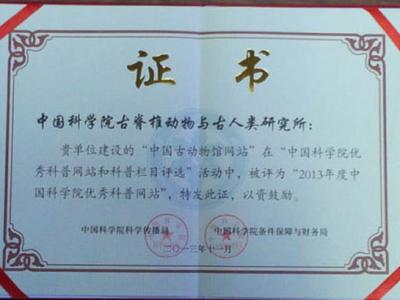 中国古动物馆网站荣获中国科学院2013年度优秀科普网站奖 (中国化石网)据中国科...