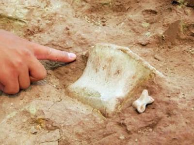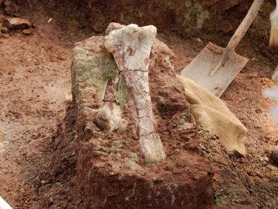 现场出露的鸭嘴龙(中)、小型食肉龙趾骨与人手指比较 据胶东在线:在山东莱阳恐龙...