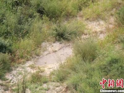 河北赤城县样田乡“落凤坡”发现的恐龙足迹,现在这些足迹已经被厚度为30公分的沙...