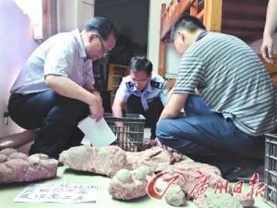 派出所民警和文物专家在清点查获的被盗恐龙蛋 河源市源城区公安分局城南派出所民...