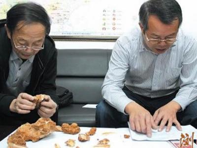 湖南省地质专家童潜明(左)与浏阳文物专家任新民一起探讨骨化石。 11月6日上午...