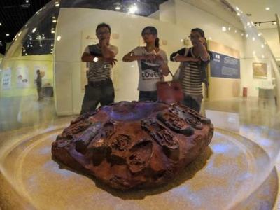 人们在浙江自然博物馆参观含有“恐龙宝宝”的恐龙蛋窝化石 浙江自然博物馆展出...