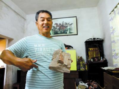 赵灿辉展示他所收藏的恐龙肋骨化石。柜子边、阳台上、车房里装着一块块用报纸包好...