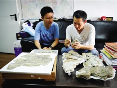 余逸伦(左)在中科院古脊椎动物与古人类研究所向徐星(右)请教问题,桌上...