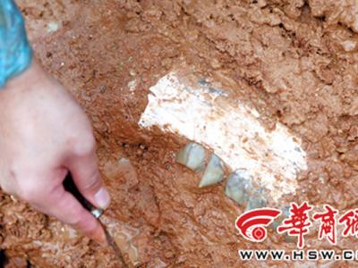 陕西自然博物馆工作人员在蓝田一河道挖掘出的三趾马上颌骨化石 发现化石的梁诚...