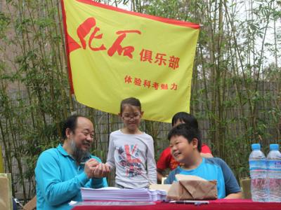 《化石》杂志主编郭建崴给孩子们普及有关化石的科学知识 参加活动的孩子在认真...