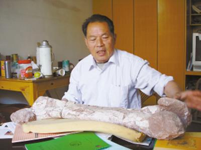 蒋严根在研究恐龙腿骨化石 最近,省内规模最大的一次恐龙展《龙行浙江——浙江出...