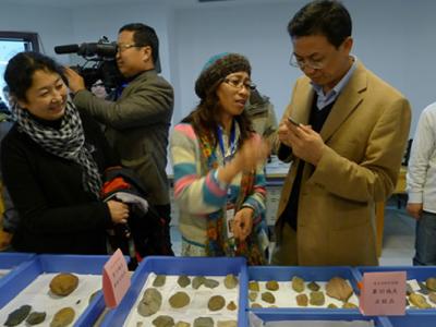 侯亚梅向周忠和所长和张翼处长介绍乌兰木伦河流域调查的石制品 2011年11月2-4日...
