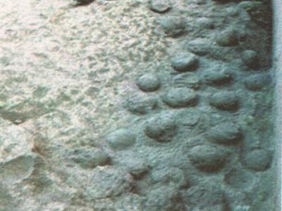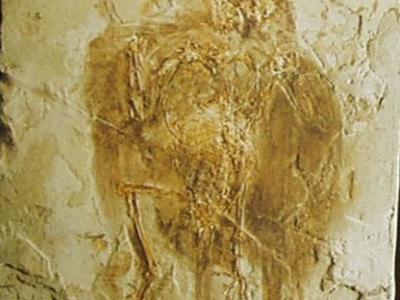 可能是蹄兔的对接拖拽痕迹;中心右侧的特征被解释为可能是粪石(粪便化石)。 (图片...