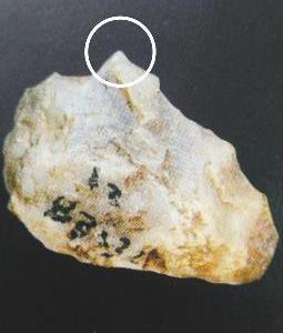 图为石头钻具,半个鼠标大小,白色圆圈处为“指垫法”打制的“钻头”。图为兽齿垂饰...