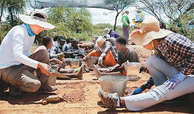 中肯旧石器联合考古队中方现场负责人赵清坡(左一)和肯方工作人员在博高利亚湖遗址...