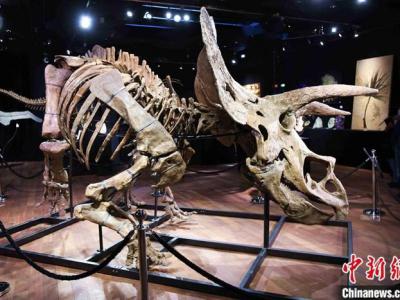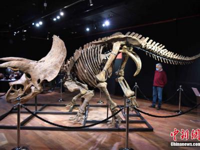 图为该三角龙化石骨架10月18日在德鲁奥拍卖行展出。 中新社记者 李洋 摄(化石网报...