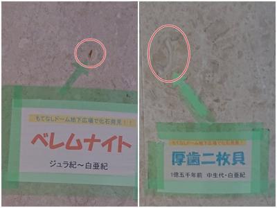 柱上的菊石亚种(左图圈中)和厚齿二枚贝(右图圈中),都清楚可见。柱子上贴有标示...