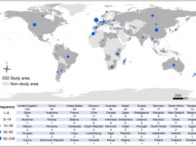 图1.2014–2023年英国研究人员描述的古脊椎动物新属种标本产地的全球分布图2.2014-...