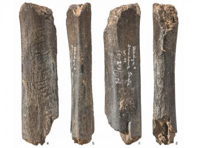 一块大约4英寸长(10.6厘米)的熊骨头上有尼安德特人留下的切割痕迹,这是一幅不同...