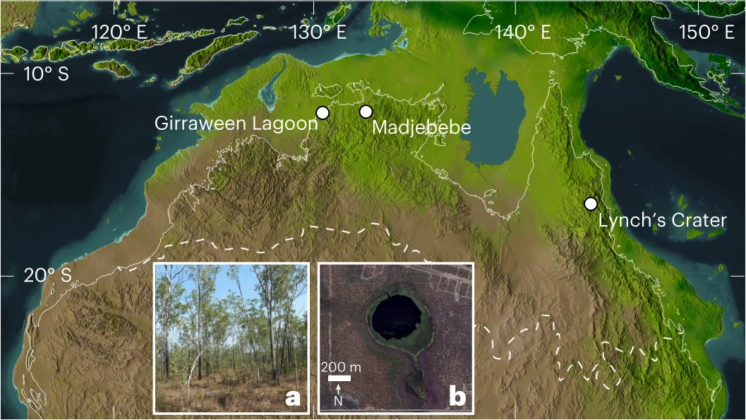 现代澳大利亚的海岸线由大陆上的白色实线表示,在最后一次冰川最大值期间,低海平面...