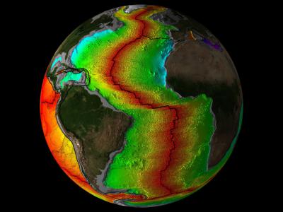 显示大西洋下方地壳年龄的图表(红色是新形成的地壳,蓝色是最古老的地壳)。(图片...