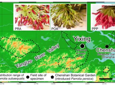 研究材料及采集地(银缕梅Parrotia subaequalis与波斯铁木P. persica)两种花色的银...