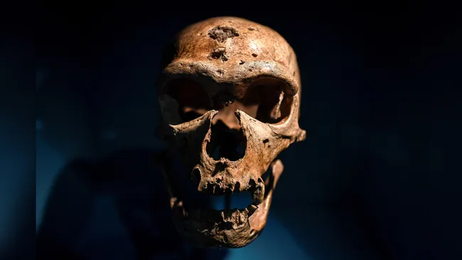 2018年3月26日,一个头骨作为尼安德特人展览的一部分在巴黎人类博物馆展出。(图片...