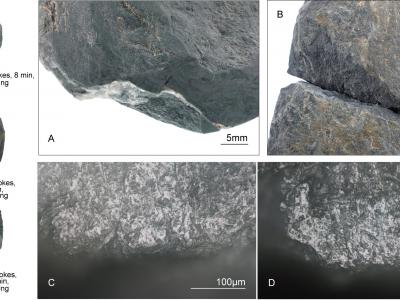 特有的宏观(顶部)和微观(底部)痕迹可用于确定石器边缘的使用方式。学分:东京都...