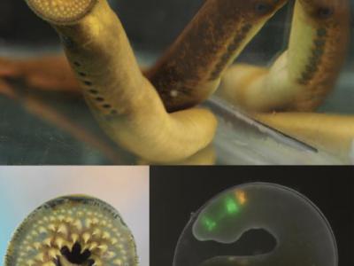 左上图是成年七鳃鳗。右边是发育中的七鳃鳗胚胎的荧光显微镜图像。图像:斯托斯医学...