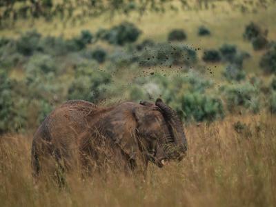 一头名为Loxodonta africana的大象在稀树草原的高草丛中向空中扔土。作者:杰弗里·...