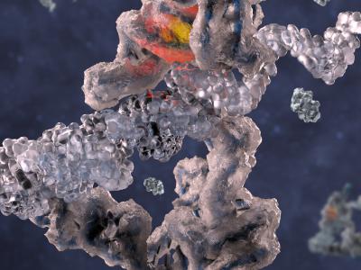 图为一种被认为与生命起源有关的RNA聚合酶核酶。核酶被冷冻在冰中,象征着它是如何...
