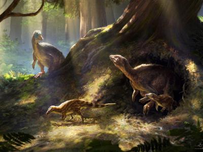 6600 万年前,地狱溪地层的森林中,一个奇异龙家族从安全地带出来觅食。图片来源:...
