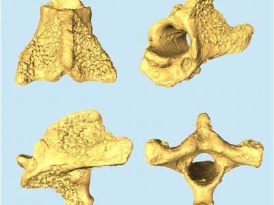 来自法国Quercy裂隙填充物的颈椎的显微CT扫描,显示了骨表面的致密结节。鸣谢:森肯...