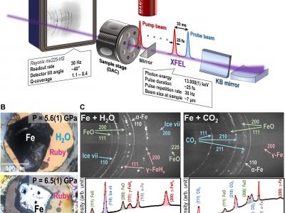 在金刚石砧座中对预压样品进行XFEL泵浦-探测实验的示意图。(A)XFEL泵和探针实验的几...