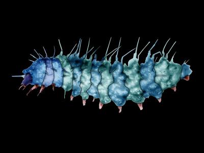 一种蝎子的幼虫,生活在一亿年前的琥珀中,背部有毛,用于附着伪装材料。信用:卡罗...