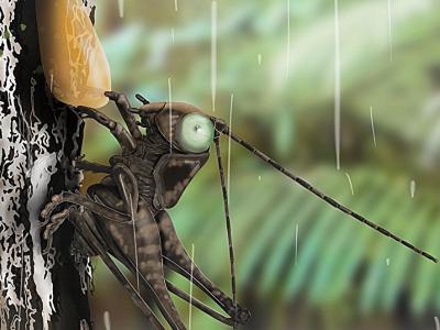 艺术家对被困在琥珀中的古代螽斯的概念。鸣谢:查理·伍德罗(化石网cnfossil.com)...