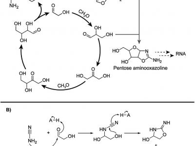 (A)最初提出的反应方案,包括Breslow的自催化循环(黑色)与RNA和TNA核苷酸合成的偶联...