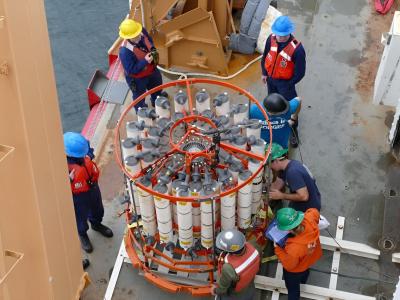 研究人员准备了一个玫瑰花结取样器,作为GEOTRACES计划的一部分,用于研究海洋中的...