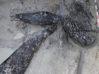 挖掘者发现了由两根重叠的圆木形成的部分结构。鸣谢:作者提供的巴勒姆等人的《自然...