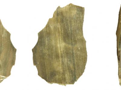 从三个不同的角度看,在约旦裂谷发现的两个薄片或手工工具之一。这些薄片帮助科学家...