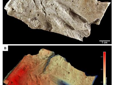 一块哺乳动物头骨化石,牙齿窝里的沉积物,原来是史前蜜蜂筑的巢穴。图片来源:拉萨...