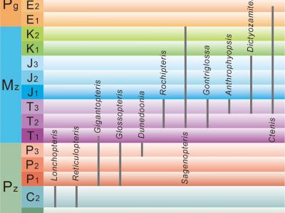 图1. 地质历史时期几种代表性网状脉植物类群的时代分布.图2. 舌羊齿属(A–D)、渔...