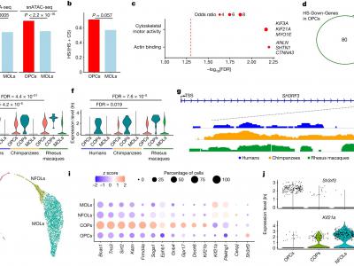 少突胶质细胞谱系中人类特异性基因调节变化。a,对于后扣带皮层,OPCs中HS调节变化...